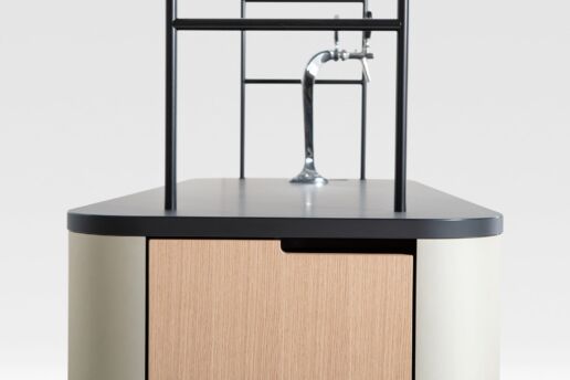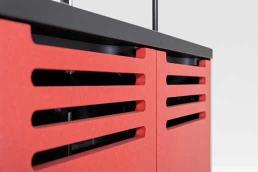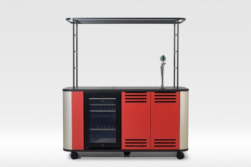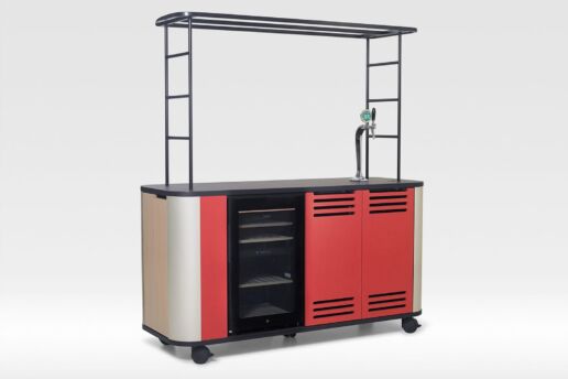 In den Barwagen integriert ist ein hochwertiger Weinklimaschrank mit zwei Temperaturzonen. Die eingebaute Bierzapfanlage stammt von einer lokalen Kleinbrauerei. Die gesamte Technik ist clever versteckt, und die Konstruktionen weisen eine entsprechende Feuchtebeständigkeit auf. Ein besonderes Highlight setzen die Formteile in metallischem Fenix NTA. Die eleganten Rundungen verstärken den aussergewöhnlichen Charakter des Barwagens. Für farbliche Akzente sorgen die rot durchgefärbten MDF-Fronten mit integrierten Griff- und Lüftungsausfräsungen.