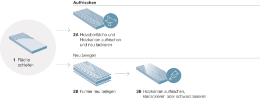 Kleine Beschädigungen lassen sich nicht immer vermeiden. Doch häufig sind Reparaturen ohne Probleme möglich. Kanten können nachgeleimt oder ersetzt werden. Geölte Oberflächen werden bei Bedarf direkt vor Ort angeschliffen und nachgeölt.