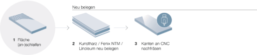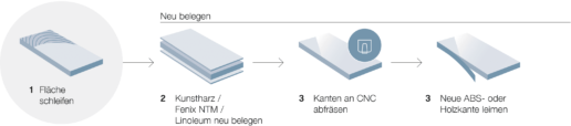 Ob furnierte Flächen oder Massivholz, ob Kunstharz oder Linoleum: Zahlreiche Möbelelemente lassen sich mit innovativen Methoden auffrischen oder neu aufbereiten. Wettstein hat sich auf das Upcycling von Möbeloberflächen spezialisiert.
